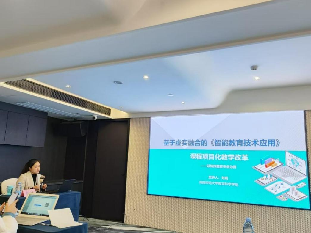 本次研修班内容涵盖了知识图谱的构建与应用、AI助教的基本原理与应用场景、AI制作教学资源以及AI辅助教学设计等多个方面。湖南师范大学教育科学学院刘娟,作了题为“基于虚实融合的《智能教育应用技术》——课程项目化教学改革”的主题分享。她从课程介绍、课程建设、教学实施、教学成效及教学展示等多个维度,深入剖析了高校教师在课程建设中提升数字素养的意义,并分享了提升数字素养的有效途径。